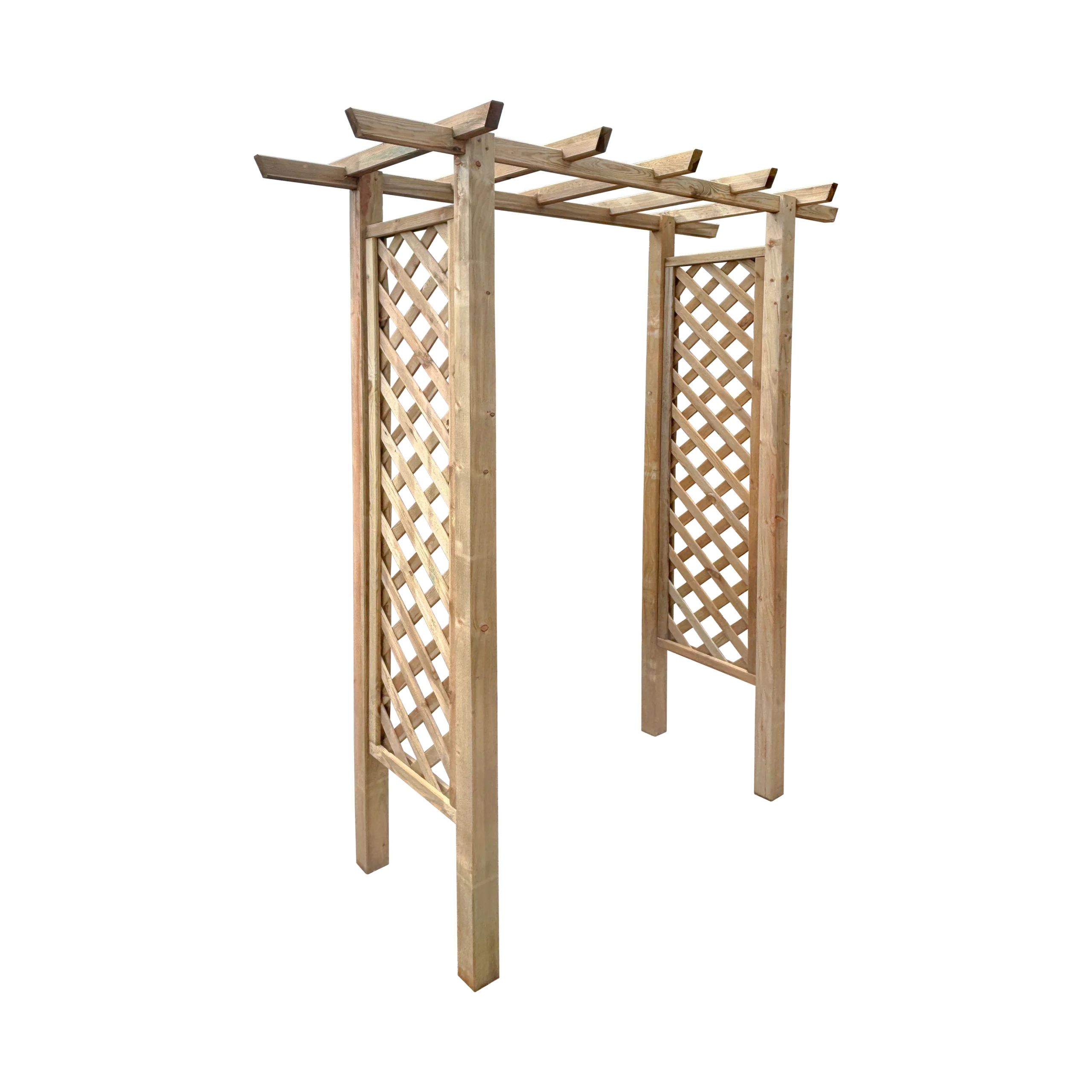 The Ruddington Arch is your practical and stylish gateway to garden beauty. It is made from planed timber and pressure treated with a copper-based solution. The arch stands at 2.44 meters high, 1.8 meters wide (from point to point), and 0.85 meters deep from front to back. It is designed to be a sturdy and attractive feature in your garden, adding to the natural beauty of your outdoor area.